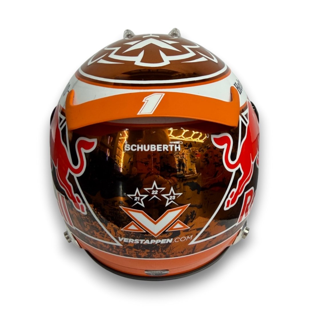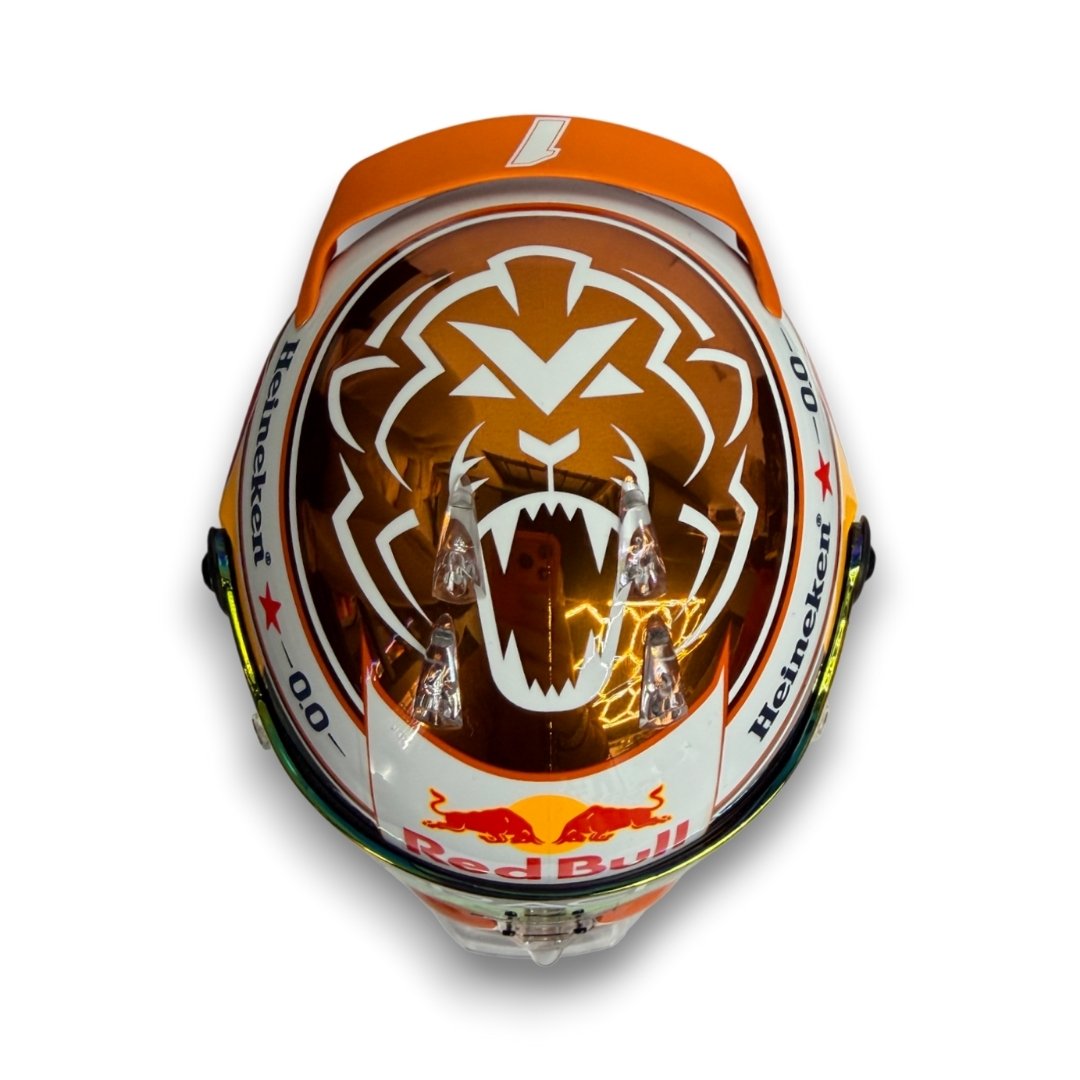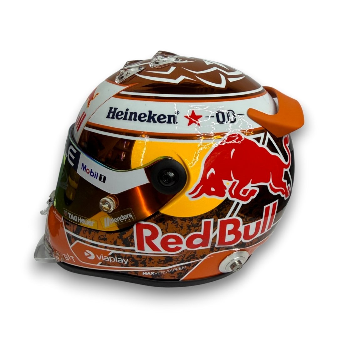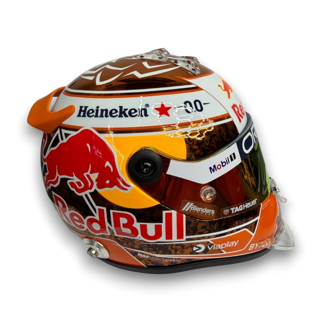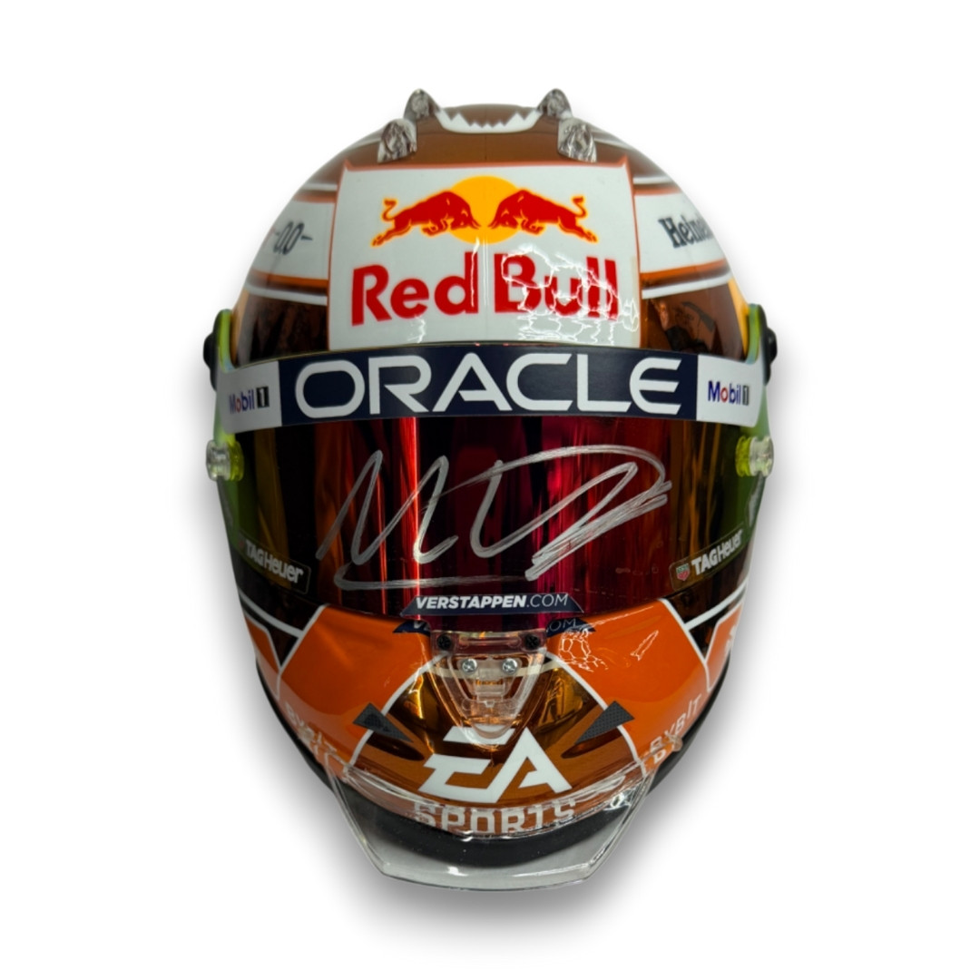 This signed 1:2 scale mini helmet reproduces the Orange Tribute edition helmet design worn by Max Verstappen during the 2024 Formula One season.
